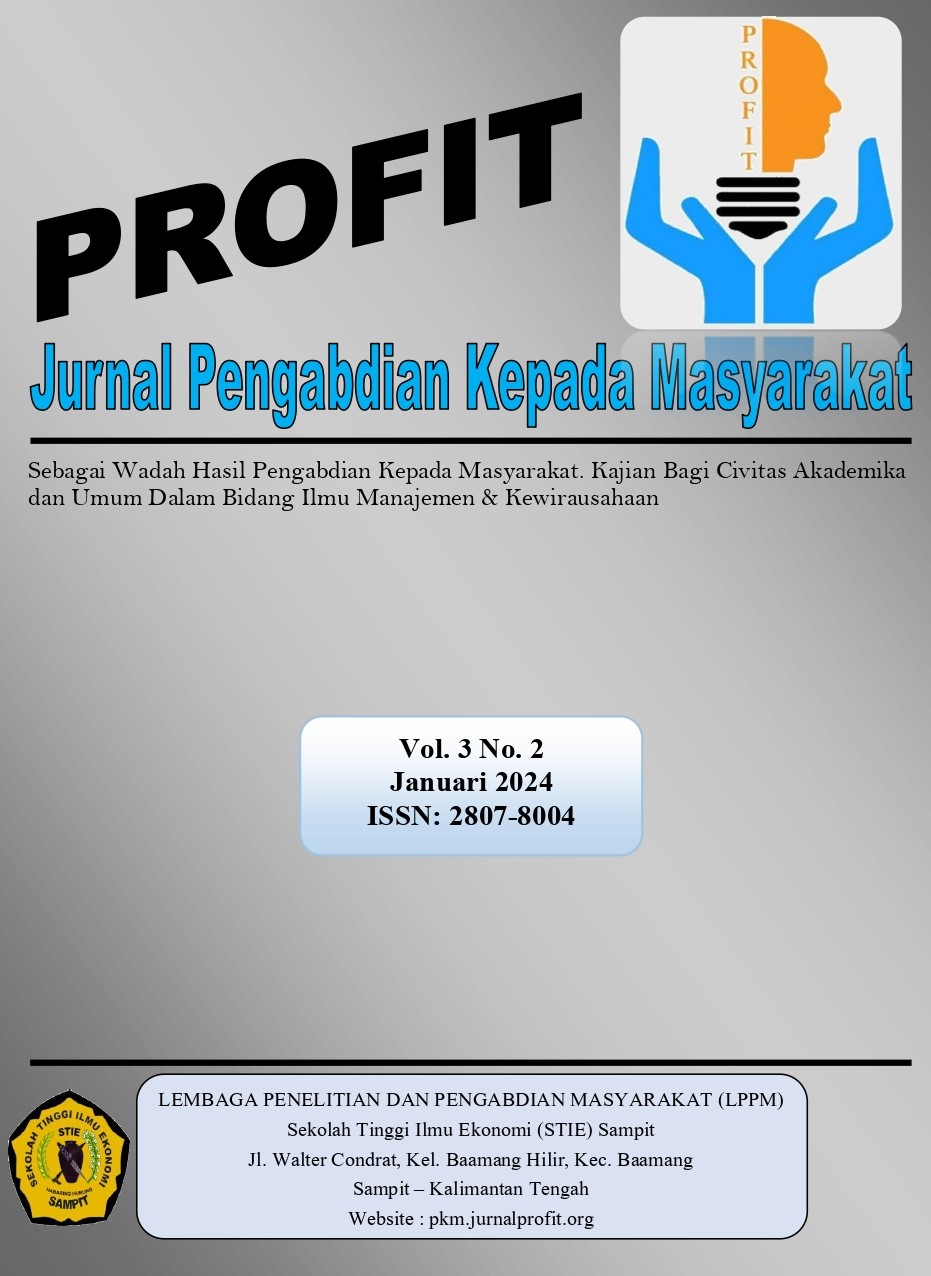 Purnomo, E. C., Hidayat, A., Krisnanto, D. B., Hafisah, D., Asifa, F., Sari, J. P., ... & Manurung, S. H. I. (2023). PENDAMPINGAN UMKM UNTUK MENINGKATKAN VOLUME PENJUALAN PADA USAHA PEMBENIHAN IKAN AMIN JAYA FISH FARM DI SAMPIT. Profit: Jurnal Pengabdian Kepada Masyarakat, 3(1), 23-28.
